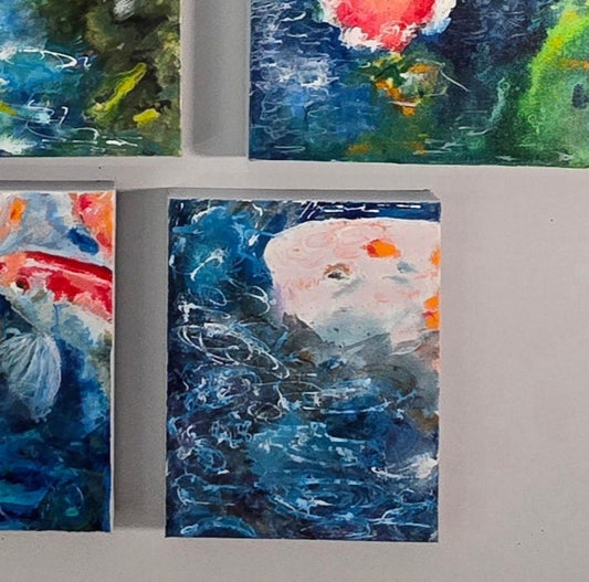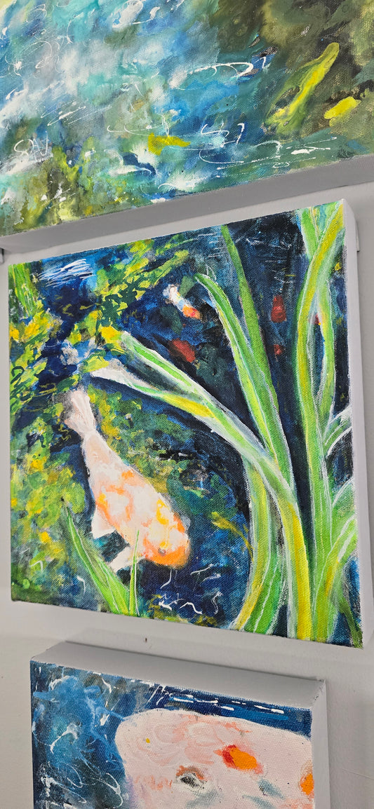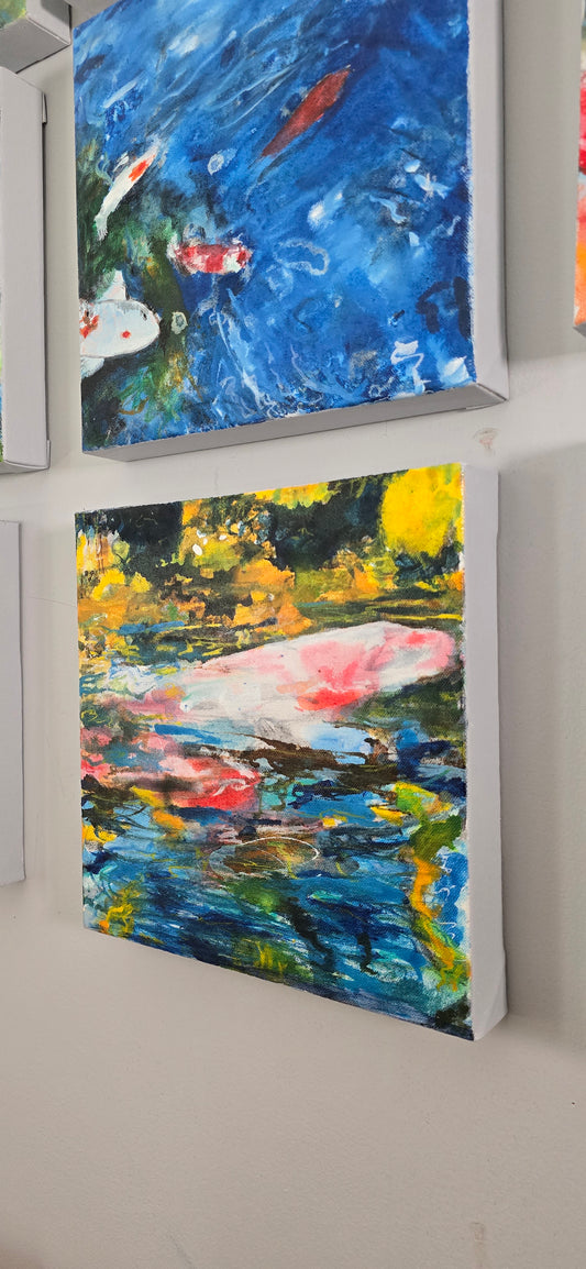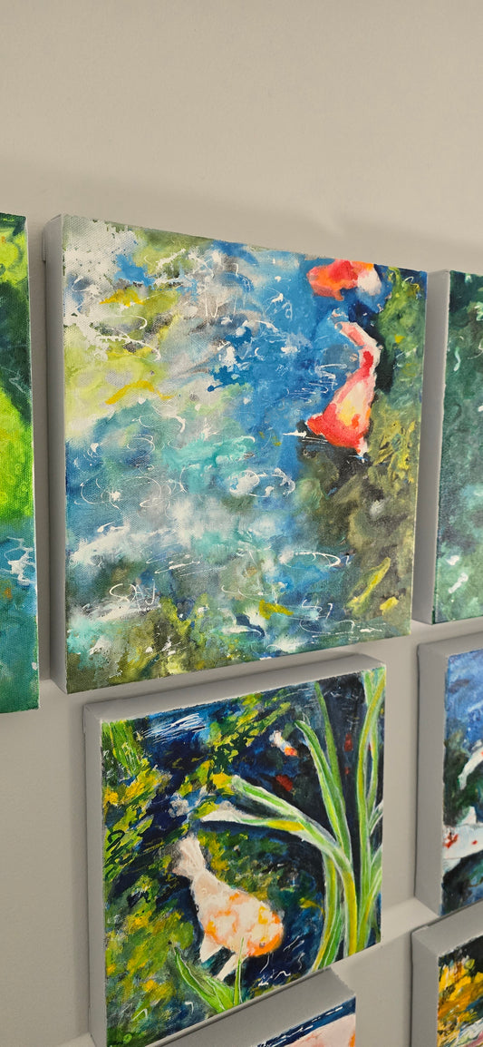 Here is a beautiful series of 10 small scale mixed media paintings on canvas showcasing abstracts of my koi pond. Each one was painted to be hung in any which way collectors would like to see them in their space. I've titled and signed all on the back of them.