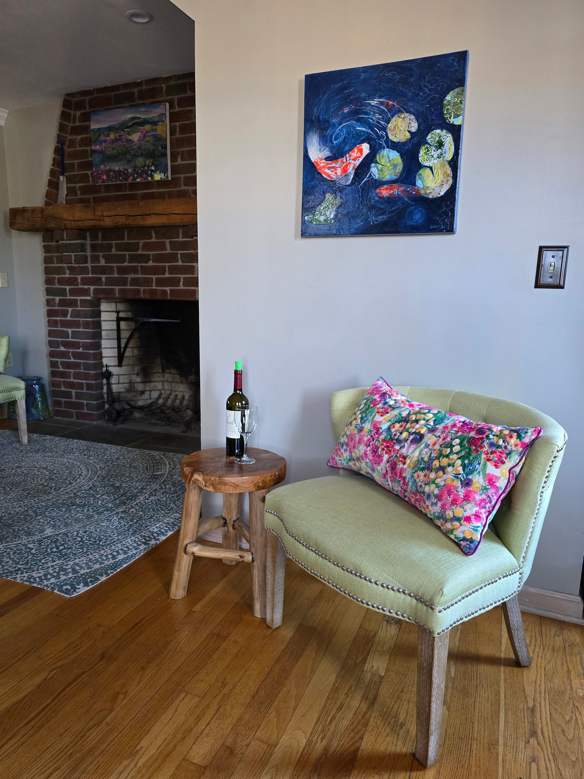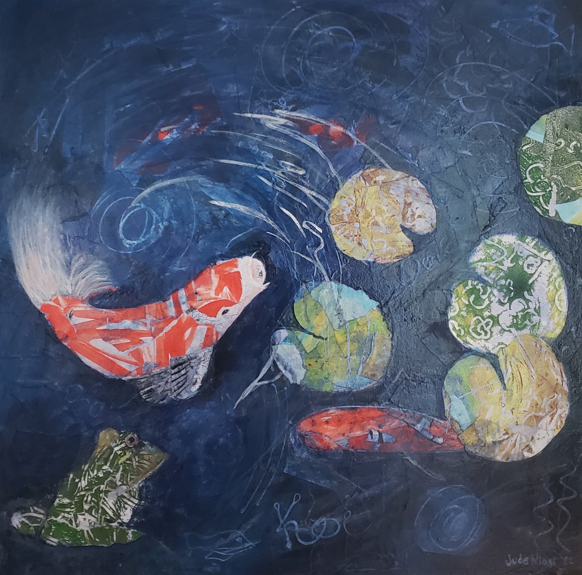 This mixed media painting uses quality acrylic products and hand painted paper on a professional grade canvas. It is varnished with an archival gloss finish that will protect the painting from fading. If you're fond of Koi fish, which in Japan is a symbol of love and friendship, where it is also becoming a universal symbol of peace all over the world, you'll love it displayed in your space.