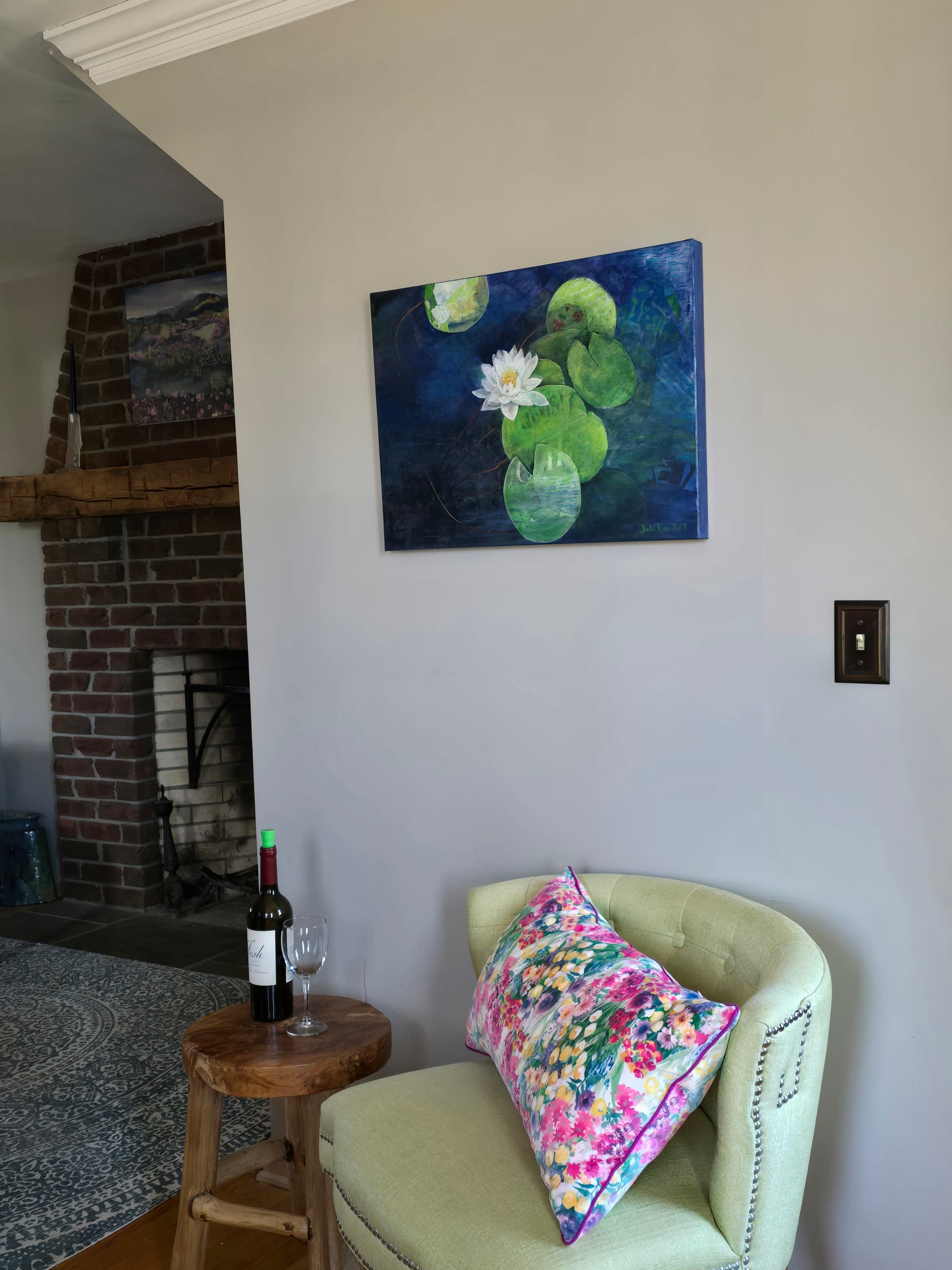 I inherited a koi pond when we bought our house. I wasn't happy at the extra work but fell in love with their beauty, the sounds of running water, frogs that live rent free, and of course the gorgeous water lily. I had to paint it and used mixed media to include paper I hand painted and acrylics. I adore this piece and hope you do too. It is varnished using high quality archival gloss medium. It's not too glossy and it makes the green pop off the canvas. Would look great in your space.