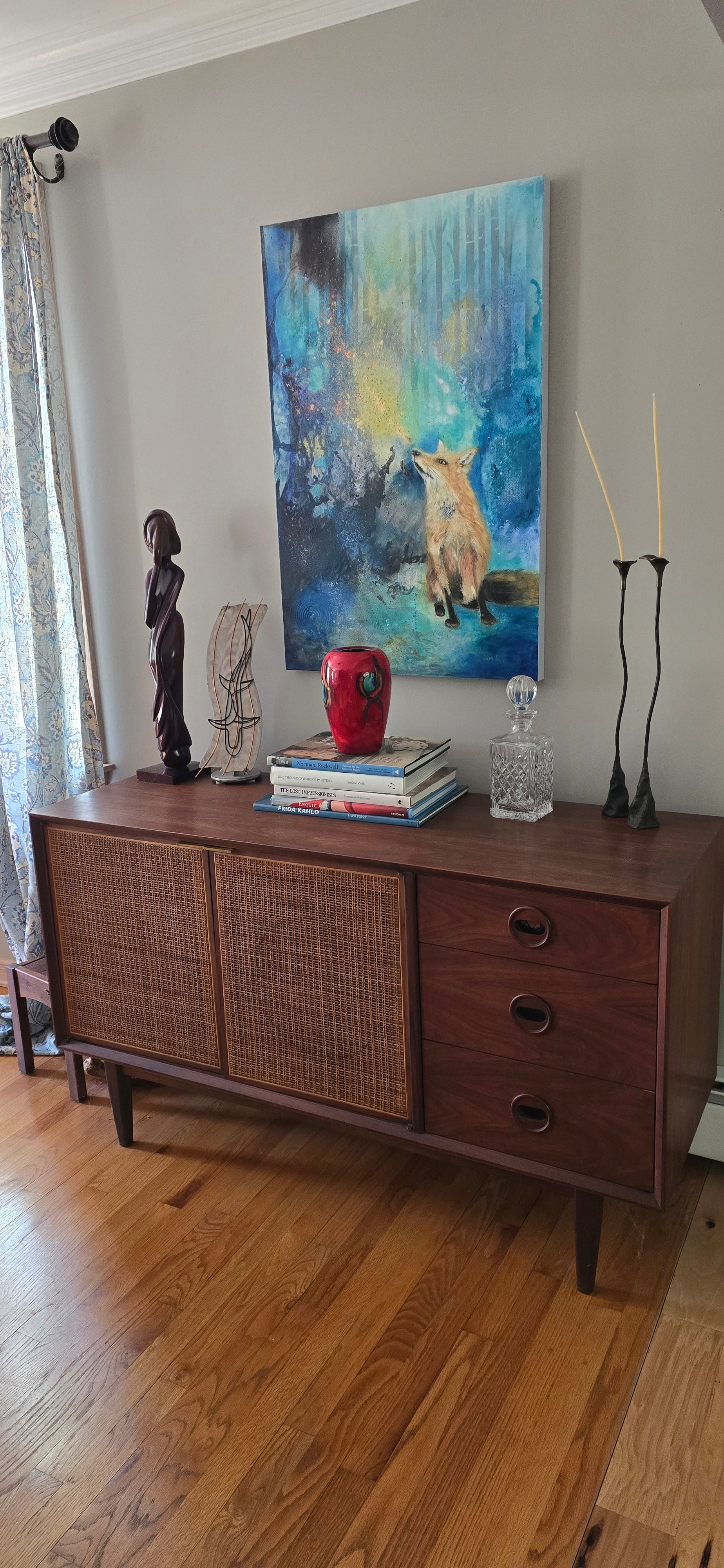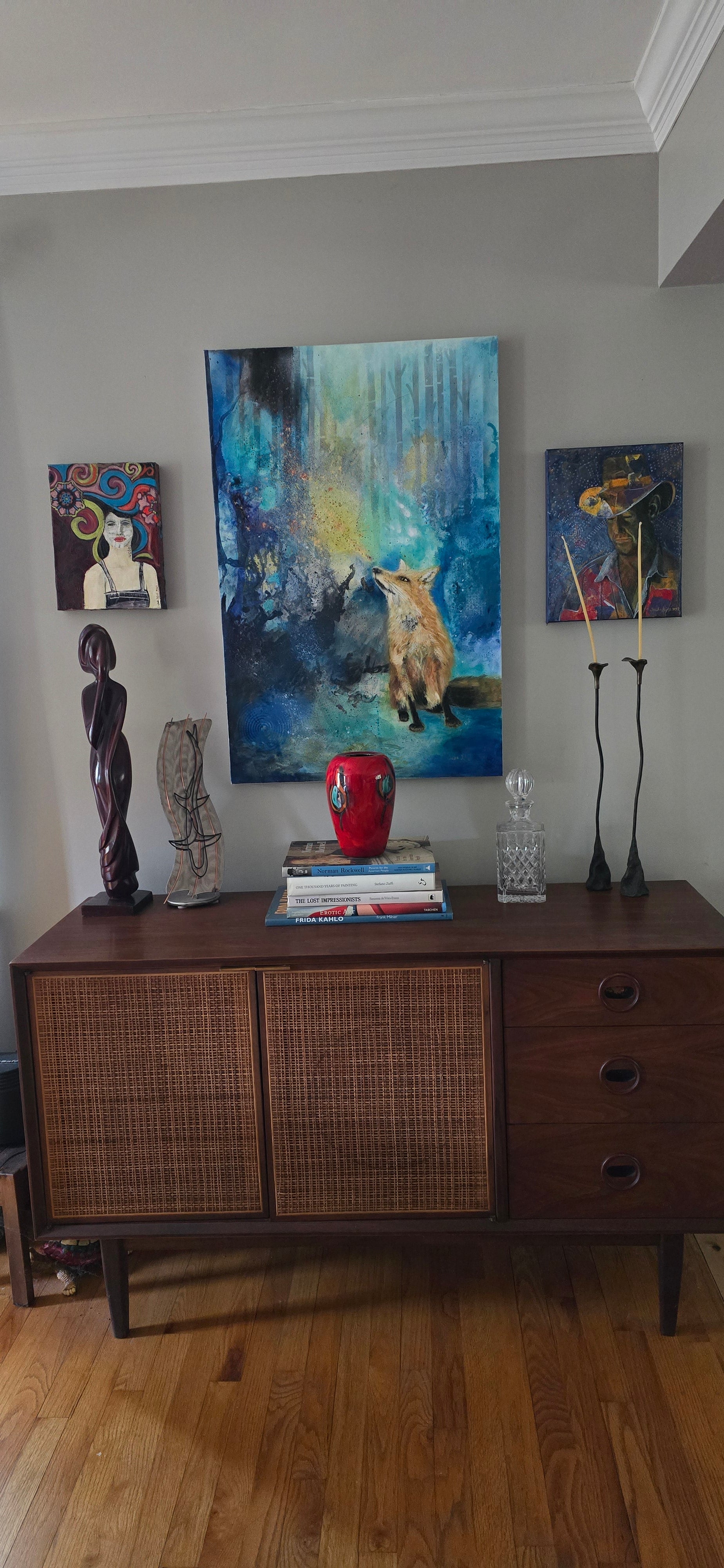 Large canvas mixed media painting of a Red Fox. Here is a 24x36" mixed media painting on a 1.5" depth canvas that does not need a frame. Ink and metallic pigments were used for that slight shimmering affect.