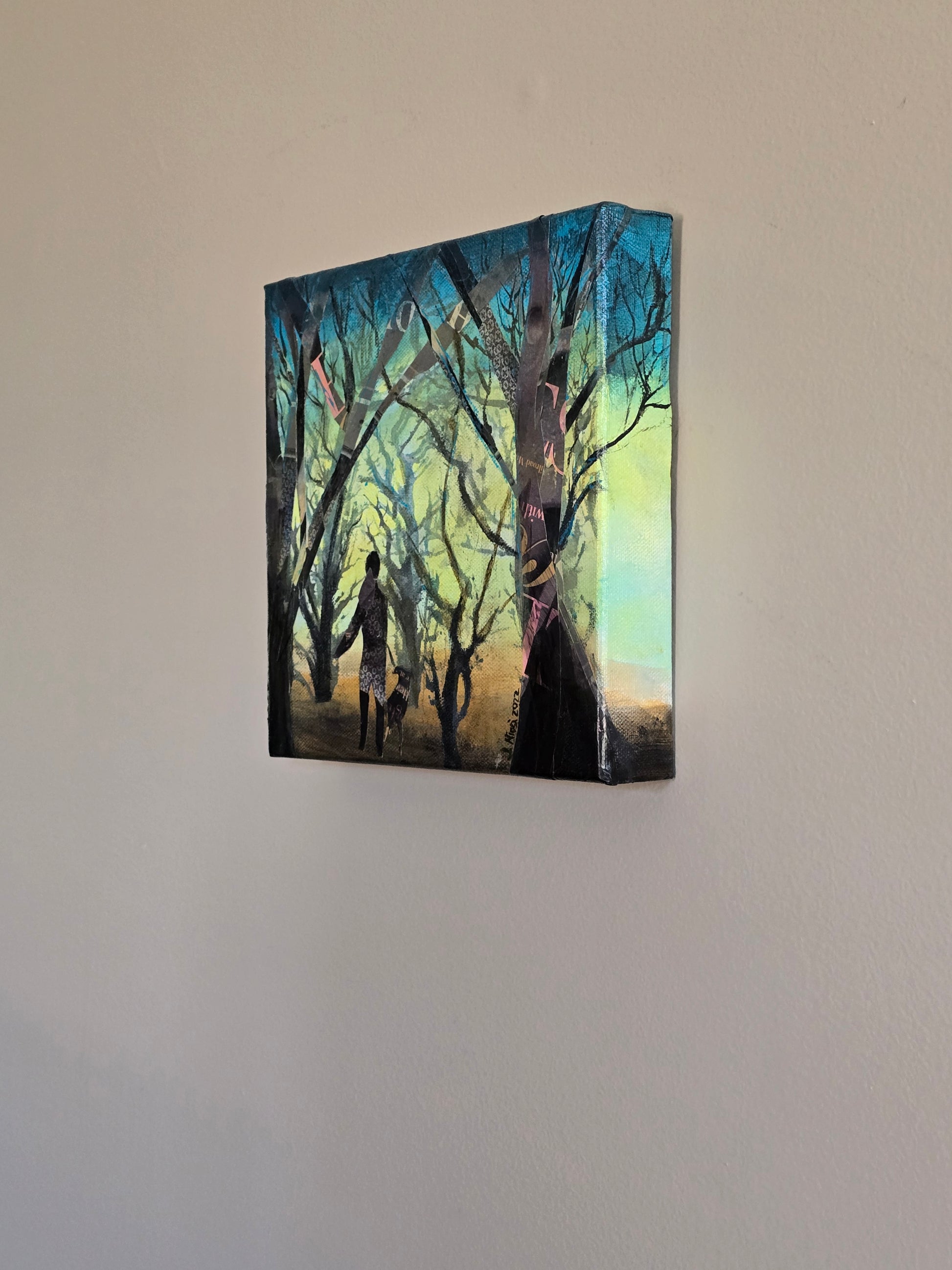 This small mixed media piece was crafted by painstakingly placing ripped paper formed into needed shapes onto the canvas. The painting extends to the sides of the canvas which should not be covered by a frame. It showcases a woman hiking with her faithful companion. If you are a hiker like me, then you know the woods are the place where we experience the beauty of nature. From the sounds of birds chirping or the sights of beautiful rocks, animals, and trees, the woods are the place to be.