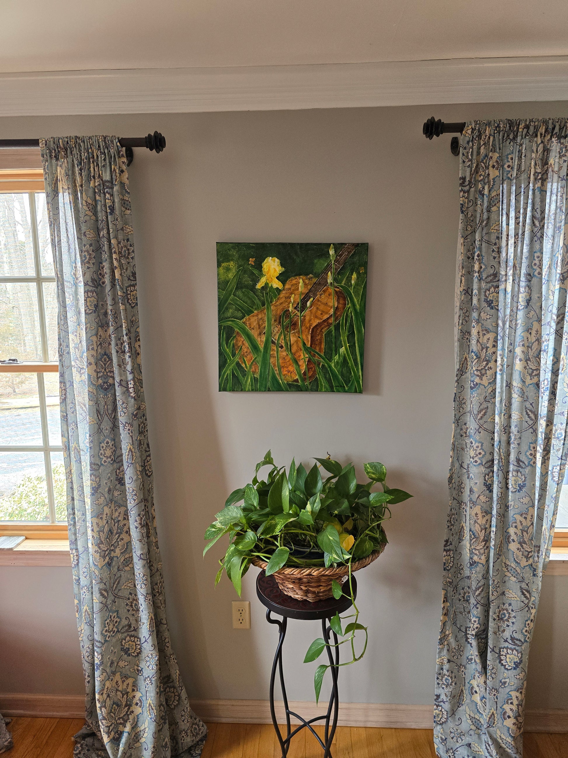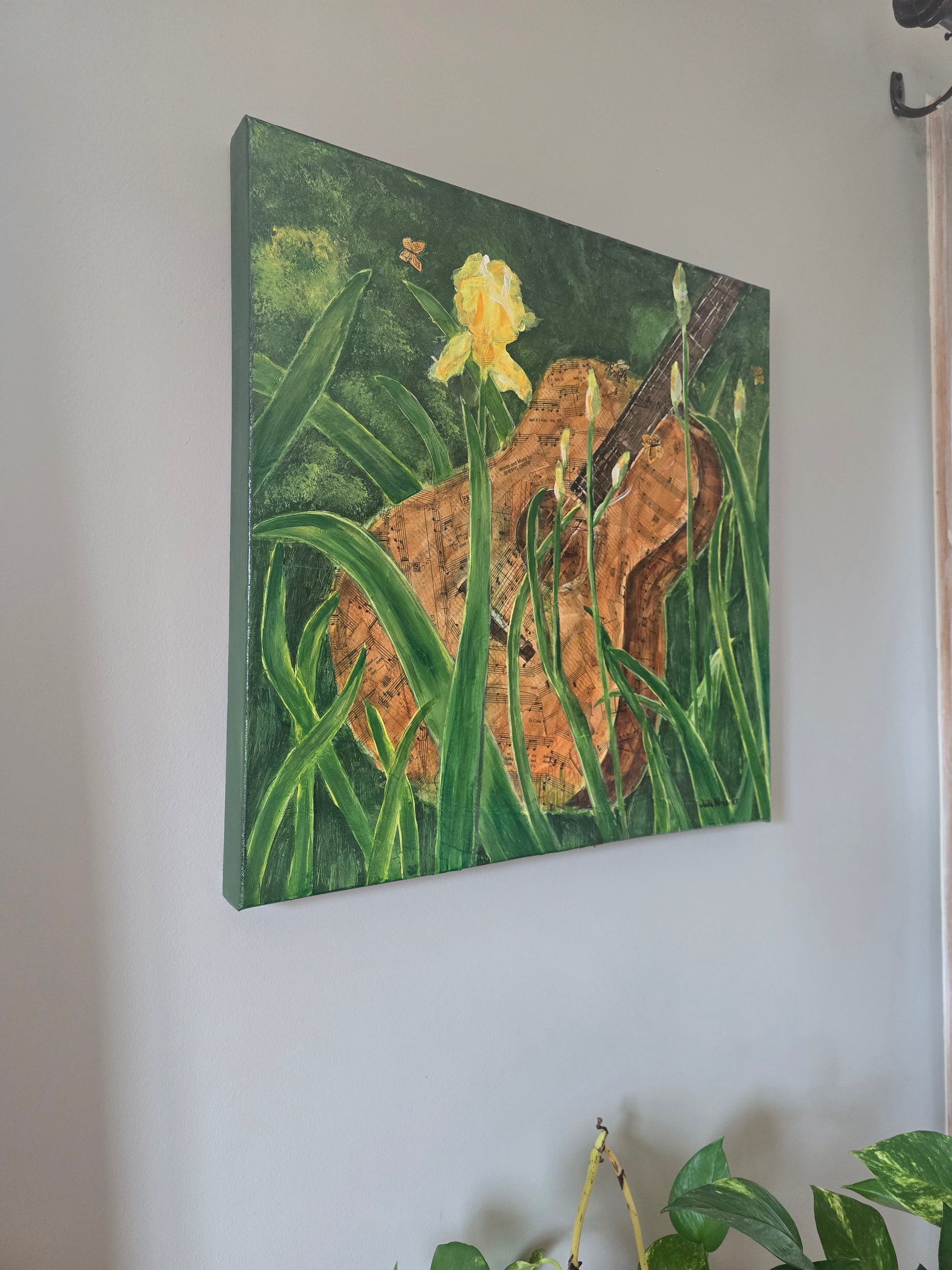 Here is a mixed media piece that utilizes music notes of the song Home by Sheryl Crow. The guitar, music notes, and Daffodil in this painting are symbolic for celebrations of beautiful new beginnings.