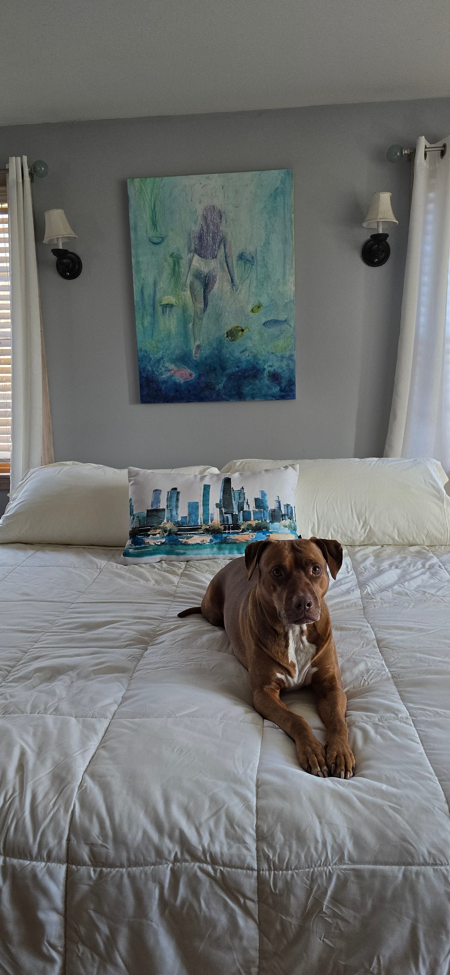 Swimming in the open sea alongside fish and swooshy blue and green colors can illuminate your space. It is gallery wrapped (painted on all sides). This was painted using high quality oil pigments.